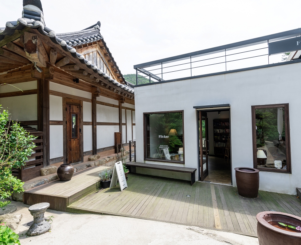 두베카페와 함께 소양고택에 딸린 플리커 책방은 2014년 처음 문을 열었다. 완주군 1호 독립서점이라는 수식어가 늘 따라붙지만, 사실 고택에 머무는 이들을 위한 서비스의 일환으로 시작했다. ‘스치다(flicker)’라는 뜻의 책방 이름은 책을 매개로 스쳐가는 영감, 아이디어, 인연을 모두 아우른다. 현재 코로나로 잠시 중단되었지만, 매달 북 콘서트나 저자와의 만남 같은 행사를 기획해온 것도 그런 의도다. 규모가 큰 편은 아니지만, 유통이 쉽지 않은 작가와 독립 서적을 중심으로 직접 큐레이션해 채운 서가는 구경하는 재미가 꽤 쏠쏠하다. 책 한 권 골라 책방 한쪽에 마련된 공간에 자리를 잡고 앉자. 시간을 들이면 한옥 책방만의 고즈넉한 분위기를 훨씬 더 제대로 음미할 수 있다.