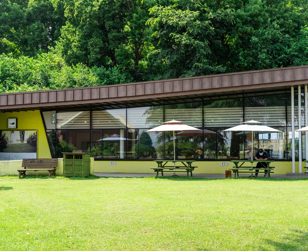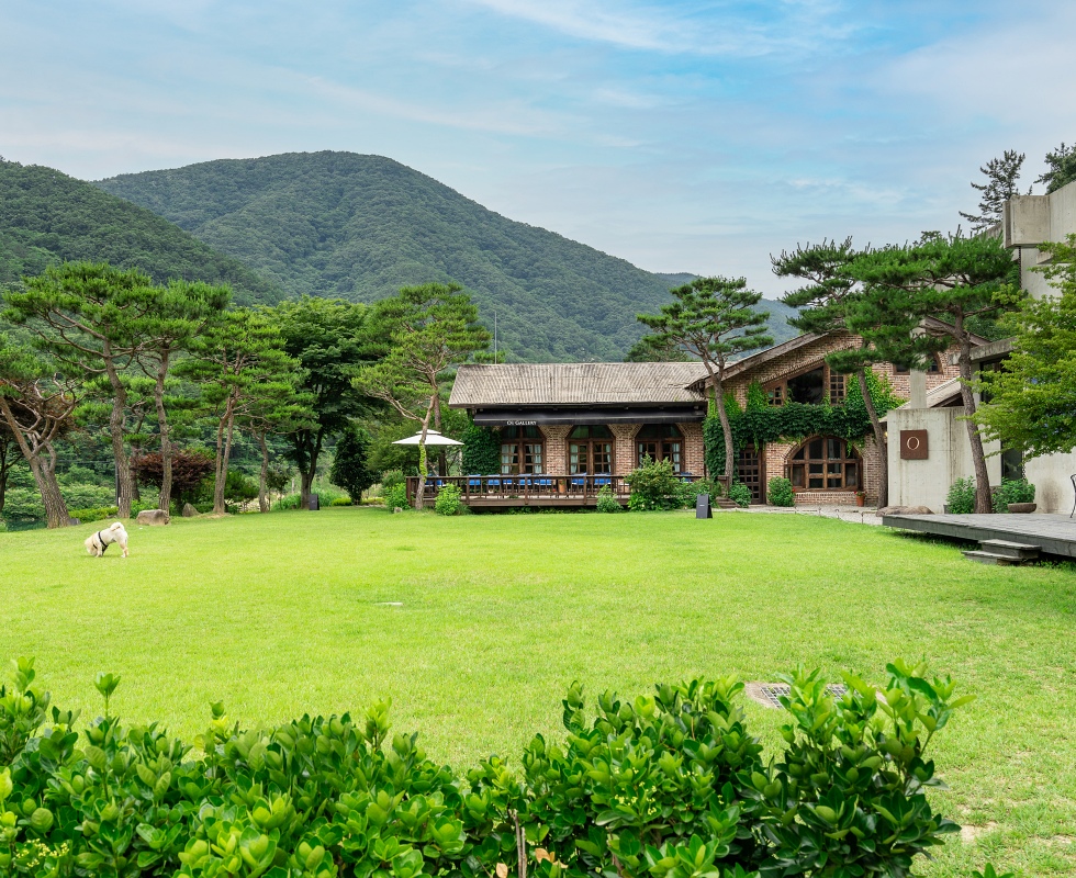 소양면 오성한옥마을의 시작은 오스갤러리라고 해도 될 법하다. 실제 마을 초입에 자리하고, 정해갑 대표가 오래된 잠사공장을 전주초등학교의 고목재와 서울 종로에 있던 화신백화점을 철거하면서 나온 붉은 벽돌을 활용해 개조한 것이 30년 전. 이 건물은 현재 카페로 사용하고 20년 전 바로 옆에 건물을 증축해 갤러리를 오픈했다. 똑같은 상업 시설일지라도 그 안에 담긴 콘텐츠가 중요하다는 철학 때문이다. 카페 한쪽에 마련된 음악감상실과 작가들의 레지던스로 활용하는 갤러리 2층의 다도방 등 곳곳에 주인장의 이러한 생각과 취향이 담겨 있다. 정면으로 펼쳐지는 너른 정원과 오성제 저수지도 오스갤러리에서 빼놓을 수 없는 요소다. 주변 경관을 해치지 않는 건축 덕분에 그 자연을 오롯이 품을 수 있는 셈. 아원과 마찬가지로 ‘아워스(ours)’에서 따왔다는 이름처럼 애써 소유하려 하지 않아서 그 가치는 배가된다.